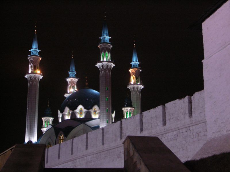 Поразил мёртвый коттеджный посёлок — видимо, в шикарных особняках на берегу Волги обитает только охрана. Взобрались на кремль и любовались видом. А потом увидели зелёные огни в окнах мечети Кул Шариф, и нам стало как-то не по себе.