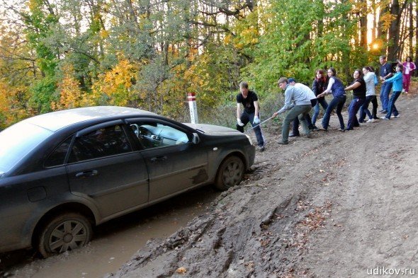 Следом едет Chevrolet Lacetti Тимура — та самая «поцелованная» машина, на которой мы ехали в качестве пассажиров. Собственно, я направляю водителя снаружи. Но «всё пошло не по плану». С самого начала машина начала крениться влево, а потом попросту стала сползать в колею. Тимур предпринял отчаянную попытку прорыва и пришпорил все 109 лошадок своего авто. Отважная легковушка с ревом ринулась сквозь лужу — казалось, что это не седан вовсе, а настоящий танк. Проехав два метра в глубочайшей грязи, машина почти выехала из колеи, но, завоняв горелой резиной, скатилась обратно — не хватило мощности.