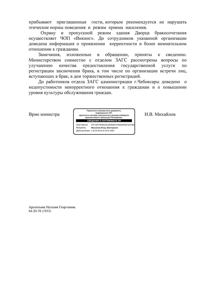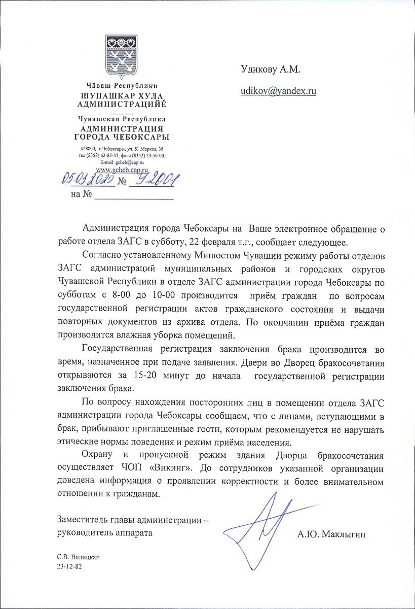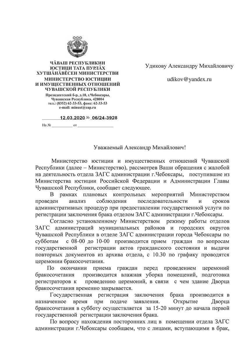 Здравствуйте! Обращаюсь в Министерство юстиции в связи с ответом 06/24-3928 от 12.03.2020 на мой запрос. Подписан он ВРИО министра юстиции Чувашии Игорем Михайловым, однако исполнителем является начальник отдела ЗАГС Министерства юстиции и имущественных отношений Чувашской Республики Наталия Арсентьева (скрин «Ответ Минюста», стр 1 и 2). Обращение я написал в связи с тем, что за 15 минут до начала регистрации своего брака не мог вместе с будущей супругой попасть в ЗАГС (двери были закрыты на ключ). А внутри находились посторонние люди в нетрезвом состоянии.