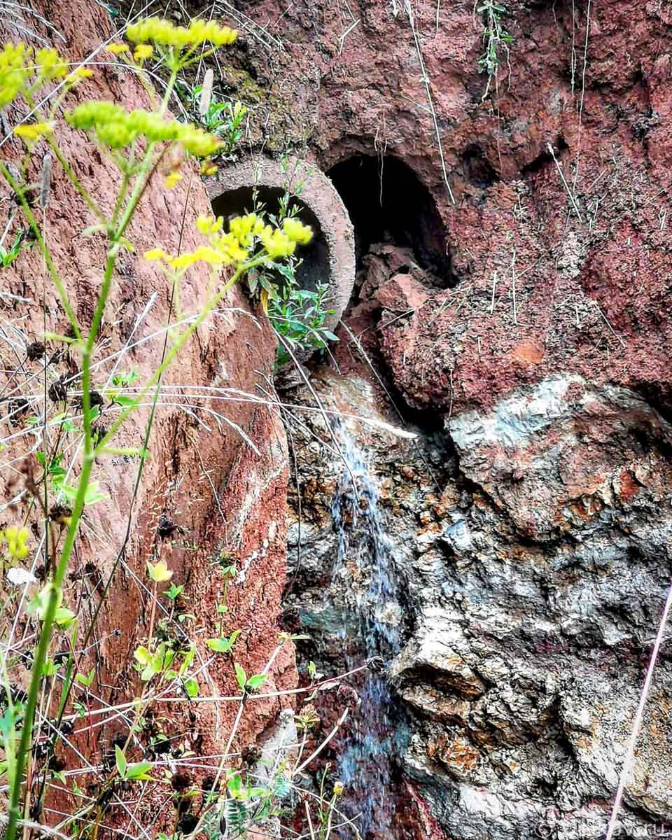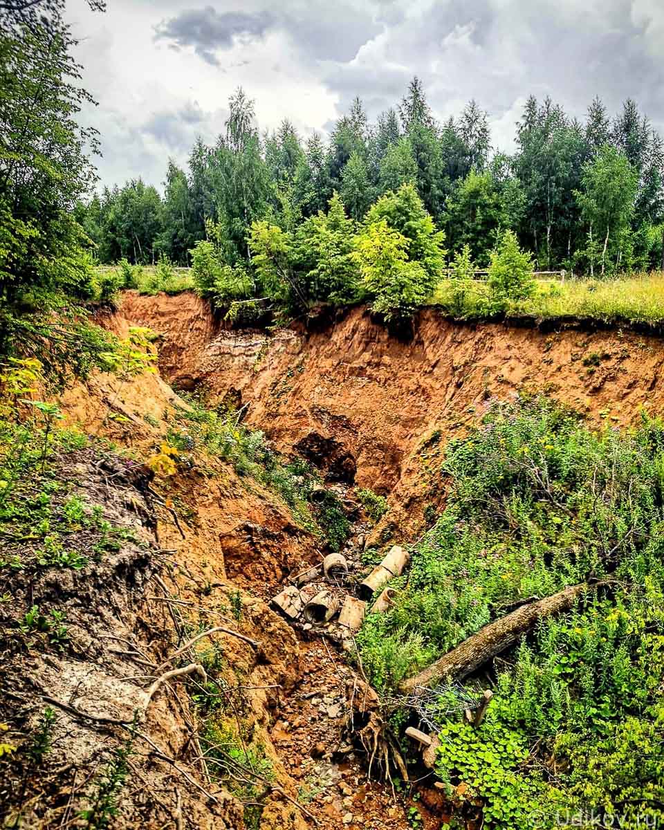 Внизу слышен шум воды, валяются остатки довольно крупной трубы. Такая же труба торчит из земли. Однако видно, что вода бежит не по трубе, а размывает почву рядом. Процесс будет у усугубляться.