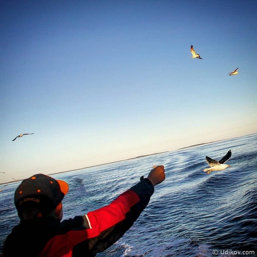 И вот мы на пароме. Отплываем. Качает очень бодренько, палубу заливает волной, половина пассажиров страдает морской болезнью — блюёт в пакетики в пассажирском салоне. Мы же мёрзнем на ветру и наслаждаемся моментом. На обратном пути, через три дня, волны уже были небольшими. Видели издалека белых. А потом нас развлекали птички. Интенсив от чаек по синхронному лову хлеба на лету объявляется открытым! Накроши хлеб на мелкие кусочки, брось его чайкам и получи благодарный дикий хохот в подарок!..