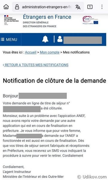 Мы потом отправляли запрос о статусе заявки, пришёл ответ о том, что заявка обрабатывается (скрины я прилагаю). По логике мне должны были выдать вид на жительство вместе с Олей. Но, увы не выдали. Не понимаю, что мне делать теперь. Ведь олина заявка на Titre de séjour уже закрыта. Моя тоже.