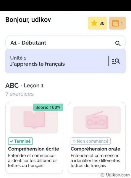 По функционалу приложение очень похоже на Duolingo. Разве что не такое красивенькое. Но это хорошая система. Теперь буду заниматься языком гораздо активнее. Я сейчас прохожу задания на A1, а Оля, как ни странно, уже на B2. И, по нашему скромному мнению, приложение несколько завысило её языковой уровень. Ну да ладно. По мне же всё верно. У меня сейчас по факту A0.