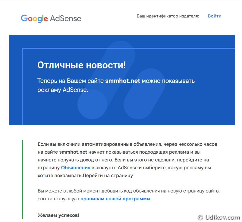 Случилось неслыханное. Мои сайты всё же взяли в программу Google AdSense. Да, с моим сегодняшним трафиком никакие рекламные доходы мне пока не грозят, но надо же с чего-то начинать. Пока запустил автоматический показ рекламных объявлений. Вижу, что они уже показываются на Udikov com. И выводятся они, конечно, пока просто невероятно криво.