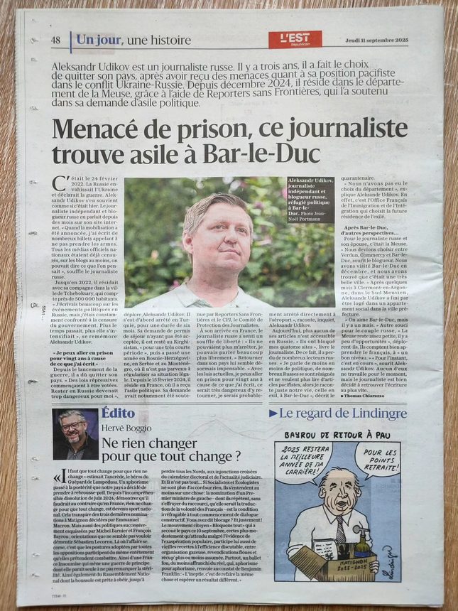 Александр Удиков — российский журналист. Три года назад он решил покинуть свою страну после того, как получил угрозы из-за своей пацифистской позиции в конфликте между Россией и Украиной. С декабря 2024 года он проживает в департаменте Мёз благодаря помощи организации «Репортёры без границ», которая поддержала его запрос на политическое убежище.