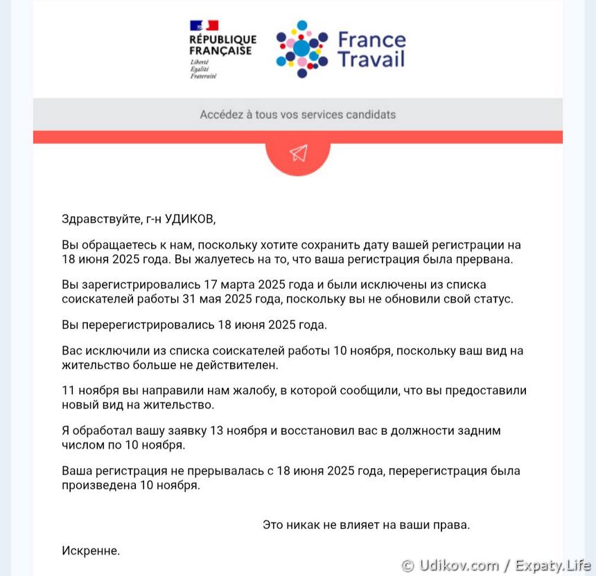 В августе мне пришло уведомление о том, что истекает срок действия моего вида на жительство, и мне следует загрузить новый документ. Я загрузил свой новый вид на жительство, действующий ближайшие десять лет. Также я убедился в том, что этот документ был зарегистрирован. Каково же было моё удивление и разочарование, когда в ноябре моя регистрация в France Travail снова была отозвана по причине того, что я якобы не предоставил действующий вид на жительство.