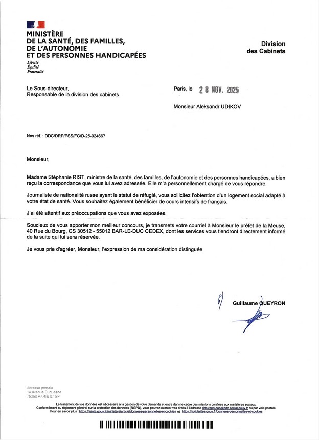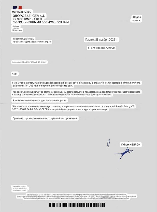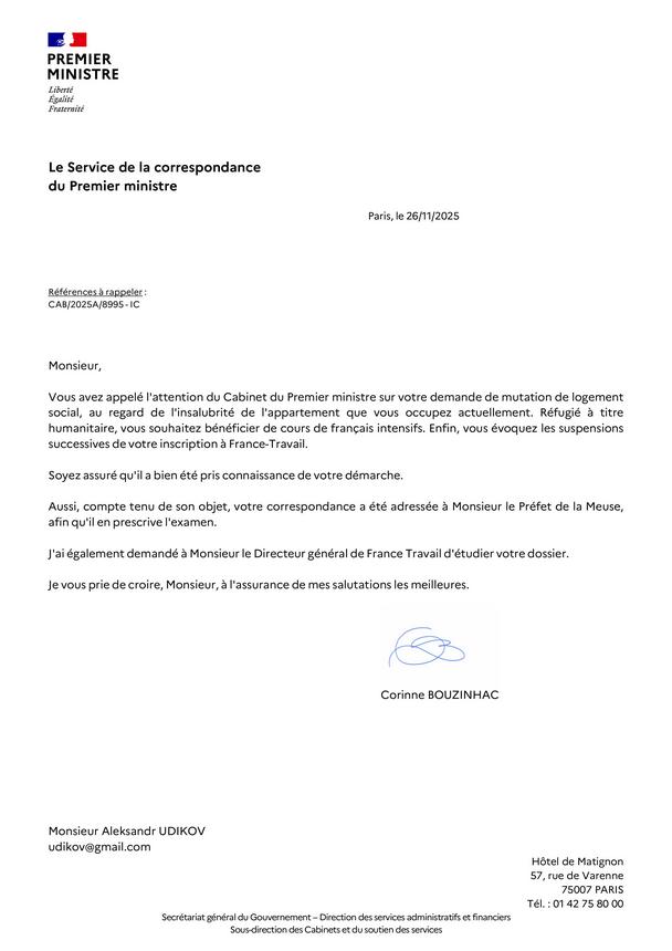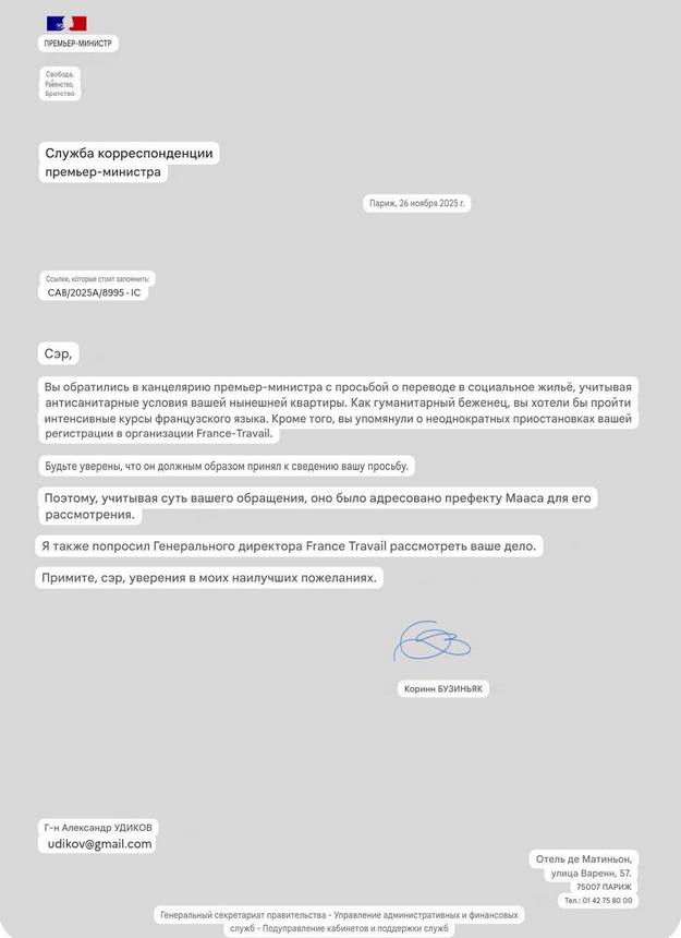 Я заметил некоторое движение в области решения наших вопросов ещё в конце ноября. Гораздо понятнее происходящие процессы мне стали после получения этого письма из аппарата Премьер-министра Франции. Сердечно благодарю Мадам BOUZINHAC за быстрый ответ и важную для нас помощь.