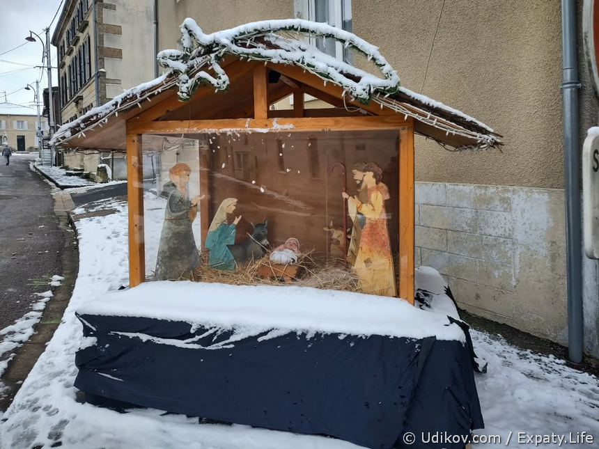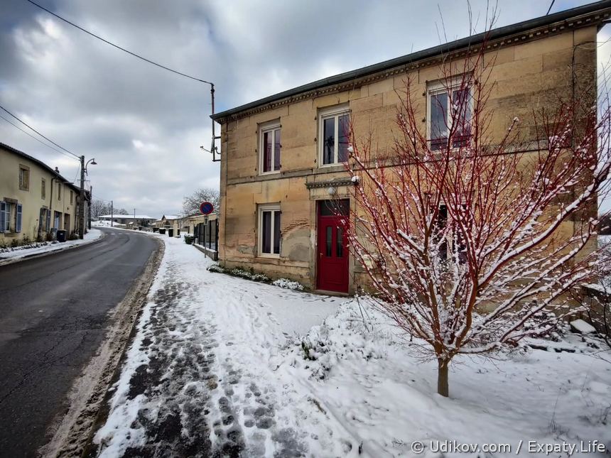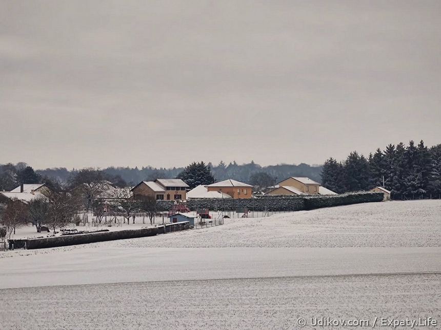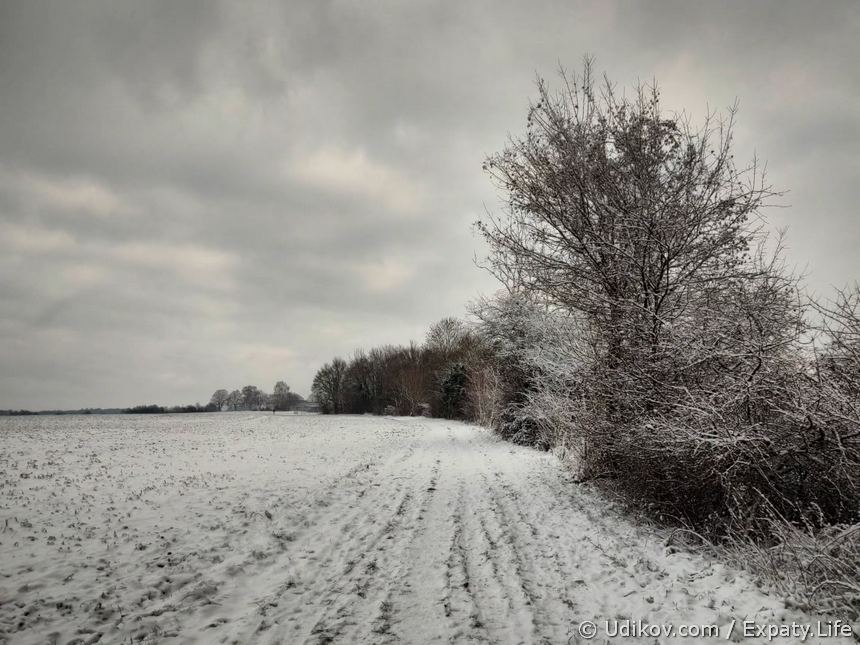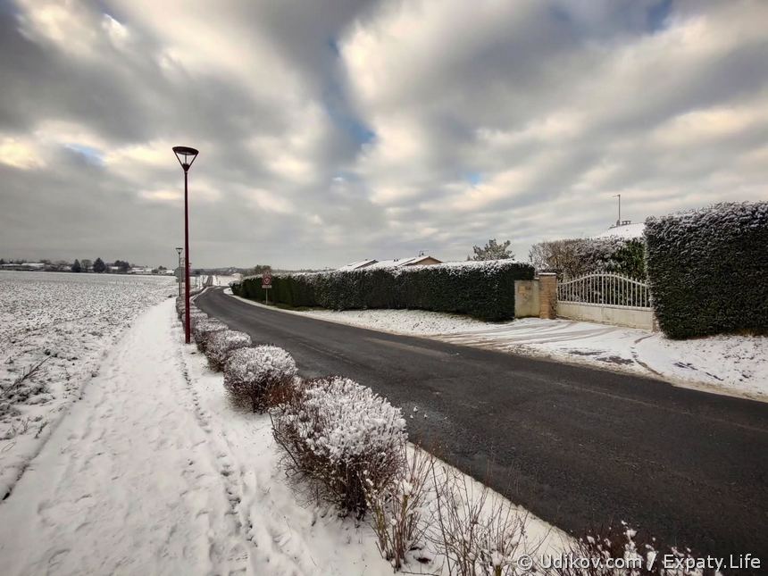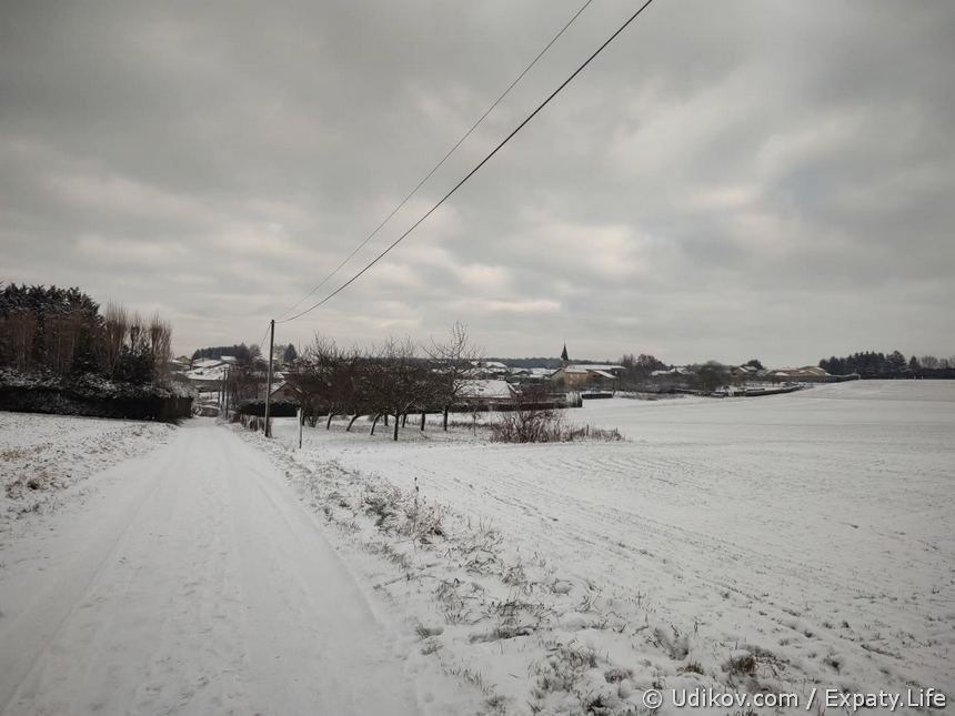 В воскресенье я прогулялся по покрытым снегом полям до ближайшей к нашему городу деревни Беон. Ощущения были привычные, очень похожие на загородные прогулки на моей родине после первого снега. Очень красиво! Разве что снег на деревьях и кустарниках лежит более причудливо — всё же растения здесь более южных видов. Люблю и эти поля, и саму деревню — там всегда тихо, спокойно, уютно.