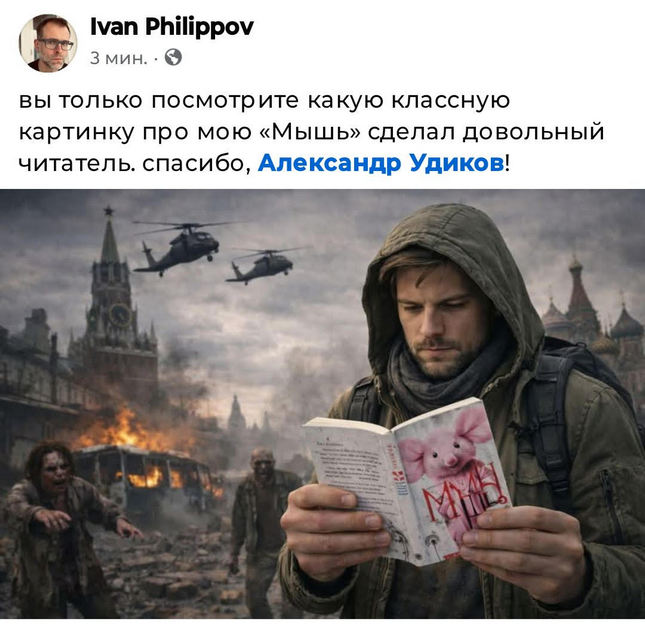 UPD. Всё же соцсети — потрясающая штука. Только что дочитал книгу писателя, и вот твоя картинка и имя уже у него на странице )
