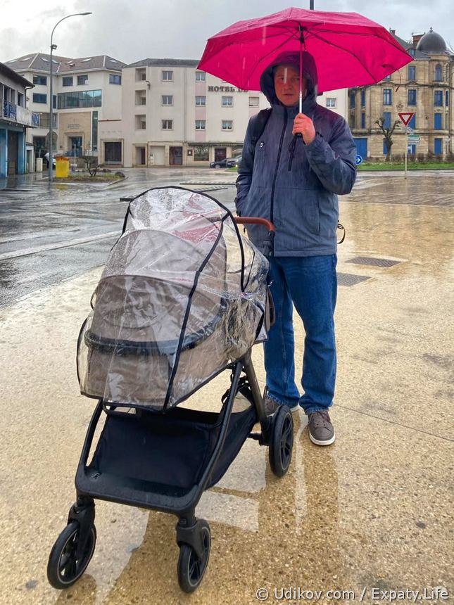 Вчера у Николь была первая после родильного отделения поездка к педиатру. Был сильный дождь, так что мы решили вызвать Uber. Но город у нас небольшой, водителей, похоже, мало. Машина так и не была найдена. Поехали на автобусе, заодно испытали новую коляску и её защиту от дождя. Николь не намокла, зато мы вымокли до нитки.
