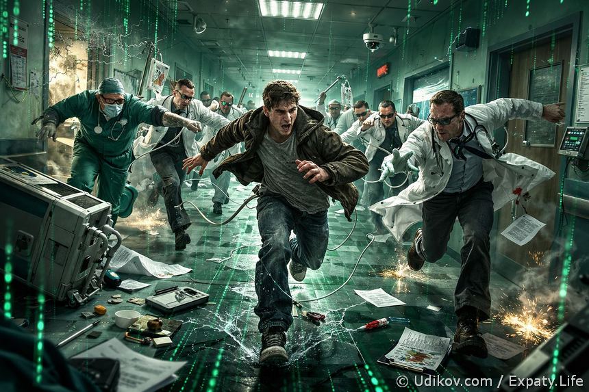 Прямо из аэропорта меня везут на машине скорой помощи в какую-то огромную больницу. Там мне объясняют, что состояние лёгких ужасное, что я запустил болезнь, что придётся полежать в больнице. Иду в палату, переодеваюсь, ко мне приходит лечащий врач. И я с ужасом вижу, что у него лицо социального работника, который отправил меня в Россию.
